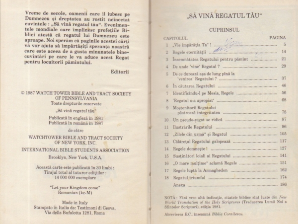 Comandă online Sa vina Regatul Tau la 6,20 lei, tiparită la editura Watchtower Bible în anul 1987 cu un număr de 190 pagini tare. Livrare din stoc cu plata ramburs sau online cu cardul.