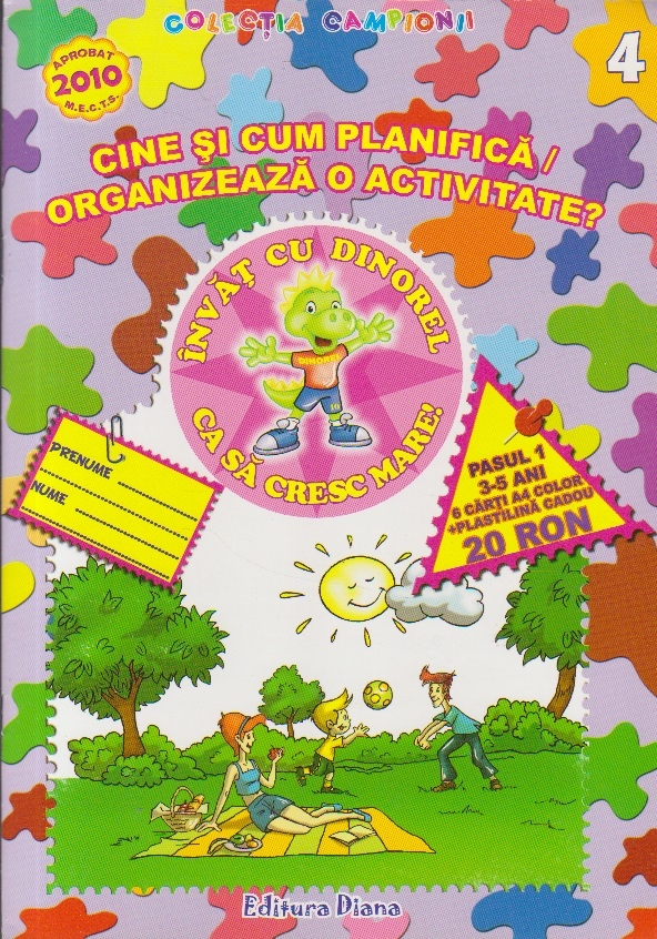 Comandă online Cine si cum planifica / organizeaza o activitate? Pasul 1, 3-5 ani (Invat cu Dinorel ca sa cresc mare) la 6,20 lei isbn 9786068127217 scrisă de Elena Filipescu , Dorina Ceausescu , Anisoara Zarnescu, tiparită la editura Diana face parte din colecția Campionii. Livrare din stoc cu plata ramburs sau online cu cardul.
